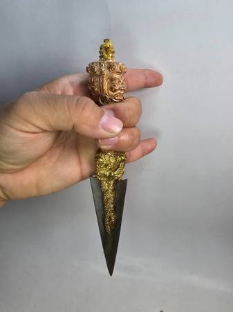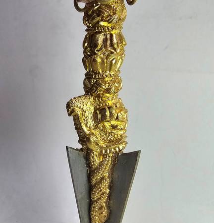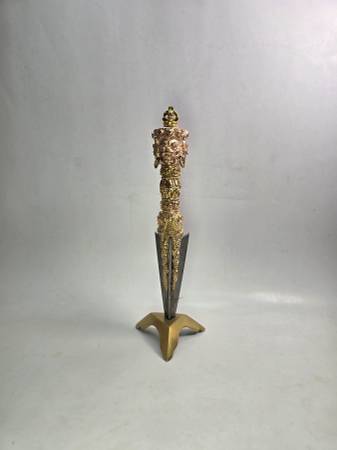 This nicely handcrafted phurba is made out of three different metals. Iron, copper, and brass which is very hard to make. This Phurba has three heads on the top. Each face has different expressions. HEE, HAA, HOO. It is 7.5 inches long and weighs about 312 grams. Phurba is a ritual dagger used to destroy evil forces and negativity. It is an instrument to protect against spiritual attacks. This instrument was created by Guru Padmasambhava/ Guru Rinpoche during the struggle against demons that were fighting against the establishment of Buddhism.
