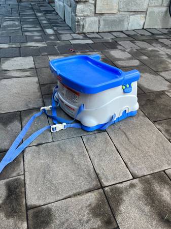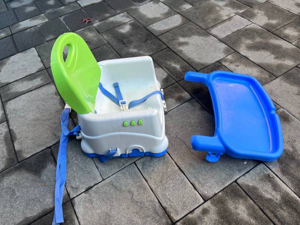 Fisher price portable booster seat. Convenience to carry into restaurants and leave in car too... Height adjust easily, Tray pops off easily and can be put in dishwasher to be cleaned easy $10 cash...