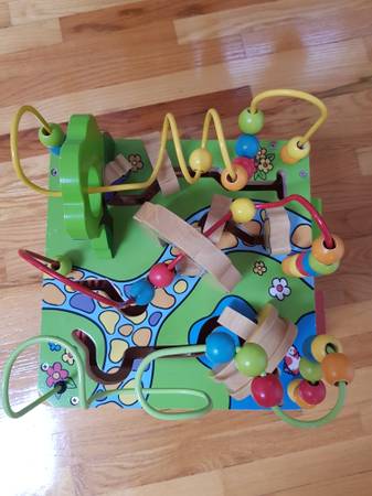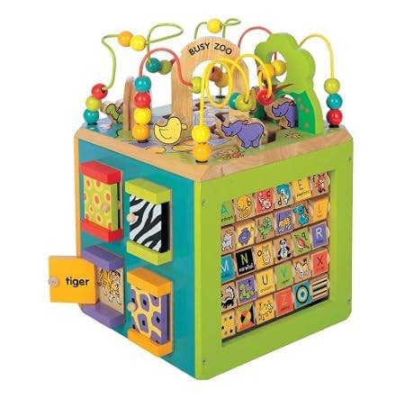 Five sides of fun, including animal alphabet, squiggly tracks, jungle design pattern doors, silly critter puzzle and snake along beads