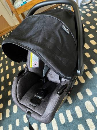 Evenflo Pivot stroller frame, seat, and car seat. The seat can be a bassinet, upright seat, or the car seat snaps on to it.