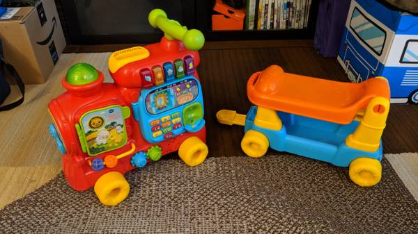 IF YOU SEE THIS IT'S AVAILABLE! Pet free smoke free home Prices below: VTech Sports Center $18 VTech Train push toy sit to stand toy $18 Trunki kids suitcase / carry on Luggage $44 Very good...