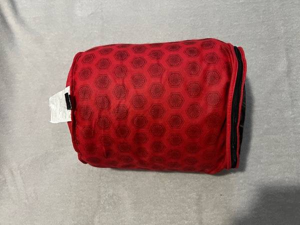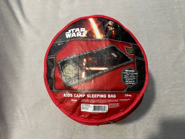 LIKE NEW Used Only Once, Sleep like a Jedi with this Star Wars themed sleeping bag featuring Kylo Ren from The Force Awakens. This rectangular sleeping bag measures 29x56 inches with a red color and graphic design. It is suitable for sleepovers and camping trips with a temperature rating down to 50 degrees Fahrenheit. The fill material is possibly polyester while the lining material and shell material are both unknown. The care instructions recommend machine washing cold. This unisex kids sleeping bag is a regular style and is not a modified item.