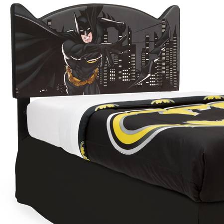Instantly transform your childs bedroom into their own Batcave with the DC Comics Batman Upholstered Twin Headboard from Delta Children. Designed to resemble Batmans mask with its perky bat ears, this sturdy twin headboard is upholstered in cruelty-free faux leather and features bold graphics of the Gotham City skyline. So be a superhero and get this Batman Upholstered Twin Headboard from Delta Children for the DC Comics fanatic in your life. The headboard easily attaches to a standard metal bed frame (sold separately) and works with a twin size mattress (also sold separately). About Batman: Dark Knight. Caped Crusader. Sworn protector of Gotham City. Batman goes by many names, but he has only one missionbecome the worlds greatest weapon against crime. His powers? Super-sophisticated gear and intelligence. Batmans utility belt and Batmoblie help him morph him into the ultimate vigilante. Made to KA-POW, Batman furniture and home decor from Delta Children add cool style to your any space while creating a fun crime-fighting ambiance that's perfect for pretend play.