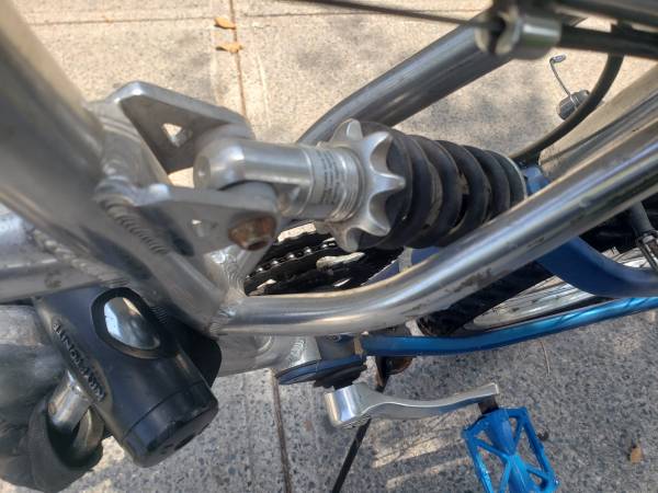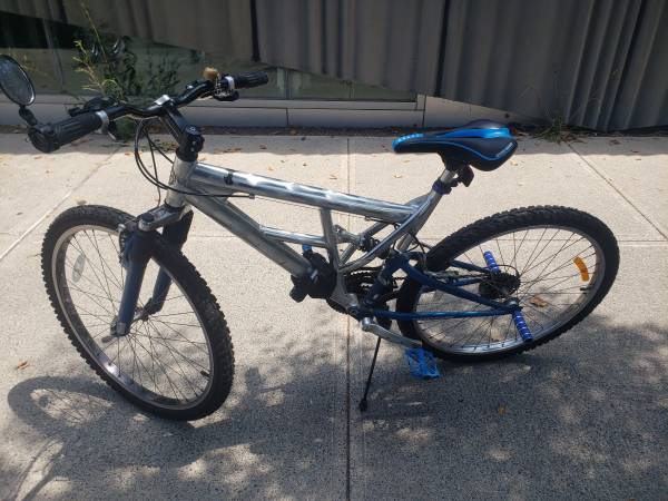 Mongoose 26" mountain bike New Schwinn tires Metal pegs Shiny silver frame Blue metal pedals 21 speed Very good condition Very strong and thick metal frame Includes Mirror and retro style gold bell...