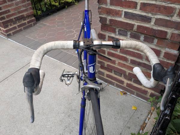 Double-butted chromoly steel frame, original Shimano Exage components and non-original vintage 700c alloy rims. The pedals, metal toe clips, cassette, and Gatorskin tires are all new as of 9 months ago.