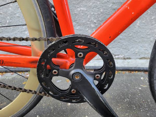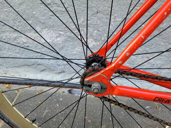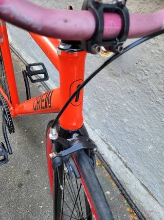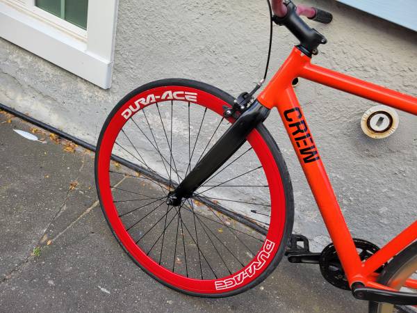 Single speed crew bike with 22 inch (56cm) light weight aluminium frame with carbon fork. Bike has 700c deep V wheels with joytech hubs, new seat, new ame grips, front brake only. Rides excellent....