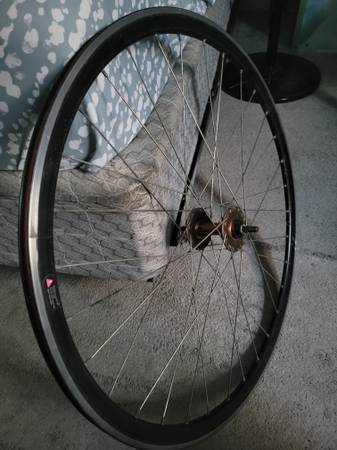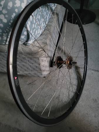 Front bicycle rim 25inches. (THRU AXLE) Rim is in EXCELLENT CONDITION NO BENDS OR ISSUES WITH SPOKES.