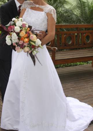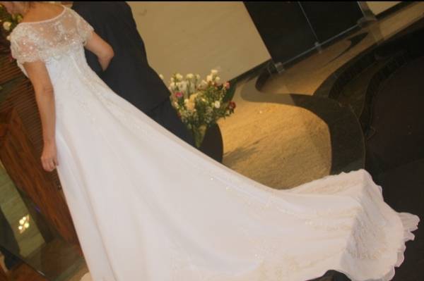 Charming A-line chiffon split front overlay wedding dress. Versatile church-to-reception look, with its beaded cap sleeves. The satin skirt is topped with a metallic-embroidered chiffon overlay. Matching capelet. Original price: gown (500 + tax), capelet (200+ tax). You´ll only pay $420 total.