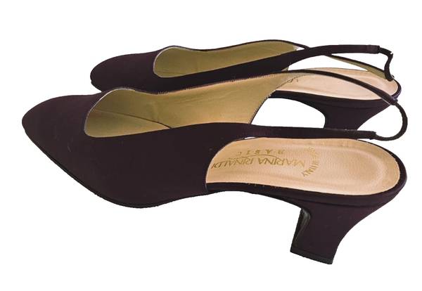 Marina Rinaldi Essenza Slingback Pumps, Size 40(9), New in the box Rich purple color satin shoes Block heel 2'' high is covered in fabric Leather lining and sole