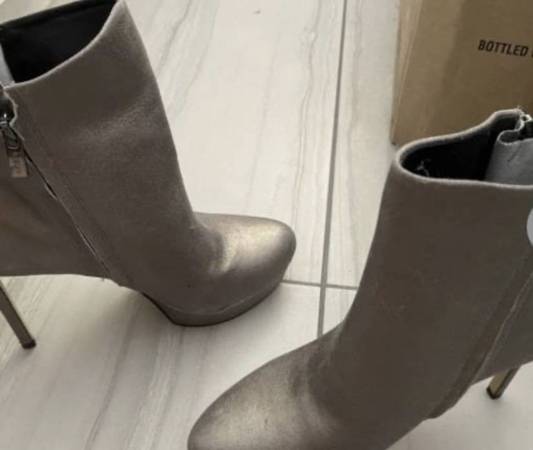New without box, Size 8-1/2, Ankle Boot. Color: Metallic Gray Bronze. Platform height is 1 inch. Heel height is 3inch. Cash only, no wire transfer
