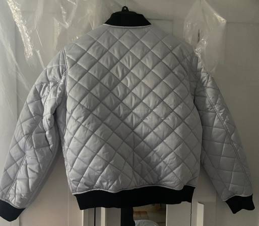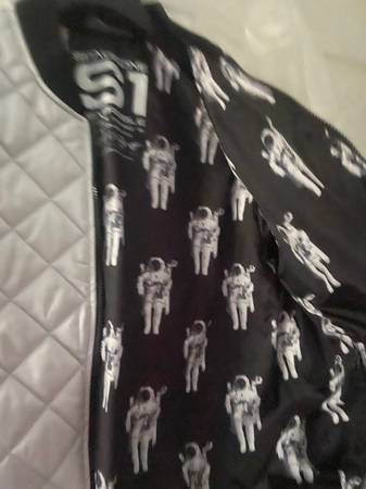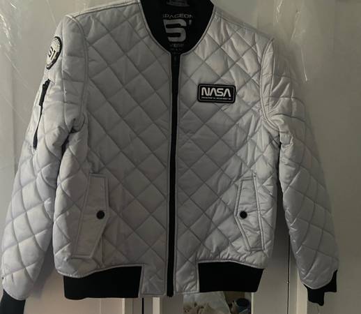Mens, Size| Medium. Light gray quilted jacket with NASA patches. Made on Earth Orig. $295. Cash only, no wire transfer. .