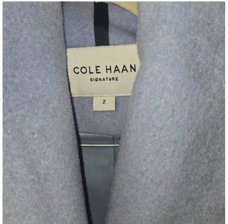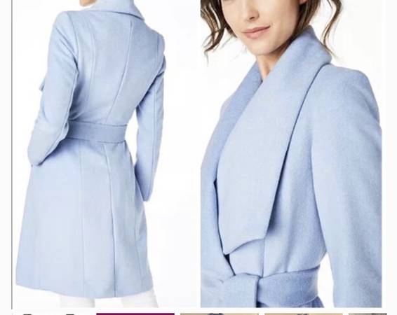 New Wool Tie coat. Orig. $440. Size: 2, Color: Light Blue. Cash Only, no wire transfer.