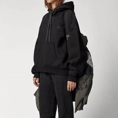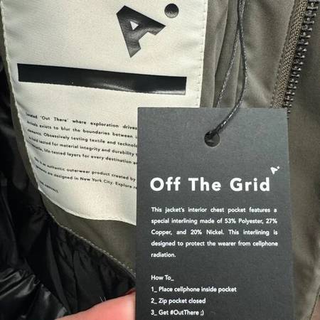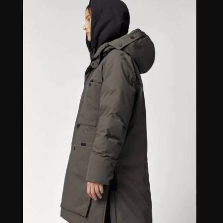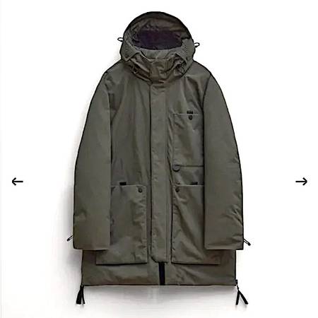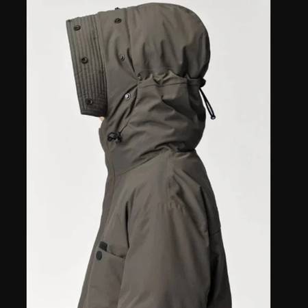 The Arrivals Noma Parka (M/L size - unisex) is made of nylon with a polyester lining. It features an oversized style with a hood, full zip closure, and water-resistant properties. This limited edition parka includes an inner pocket and exterior pockets, making it practical for outdoor activities.