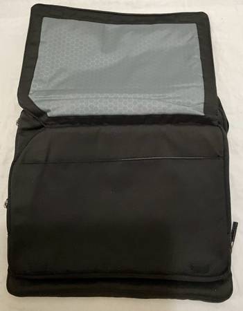 Black ballistic nylon shell, large zippered pocket for device with front flap/zippered compartment.