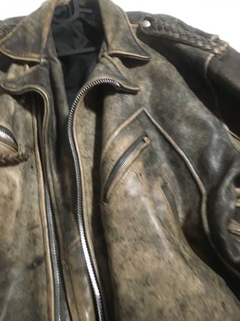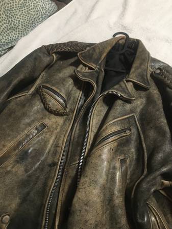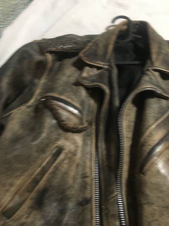 Weathers right.. thick leather distressed brown biker jacket no rips no stains all zippers work $75.00 call or text is fine @
