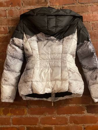 Selling a new Moncler padded down jacket. It features a black, white, and gray mountain pattern. Purchased around 2015 and kept in climate control storage. Perfect for staying warm and stylish during colder weather! Never worn unused! Size women’s small. Email for more info or picks.