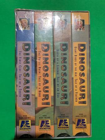 Four-part VHS series hosted by Walter Cronkite. Explores dinosaur history. Sealed box. New and unopened.