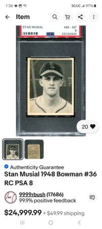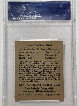 This 1948 Bowman Stan Musial Rookie Card in an extremely RARE vintage baseball card. Professionally graded at a PSA 7. According to the PSA pop report, there have been 1,863 of this card graded, only 77 have been graded higher. ONLY 4% higher! Other 7 grades that have been graded OC (Off Centered) are going for 10k, and a grade 8 is going for $25,000!