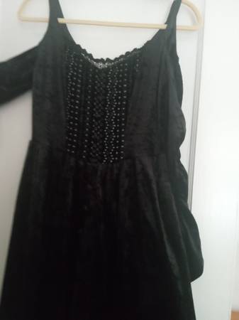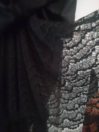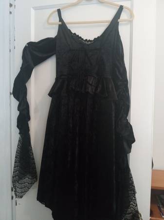 Black velvet, Chantilly lace under slip,cold shoulder, double tie back, scarf hemline . Think Stevie Nicks M-ish $50 Wine color strapless formal gown with matching shrug . L-ish $40 Both custom made...