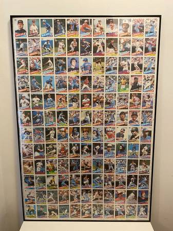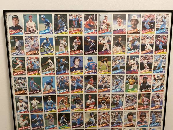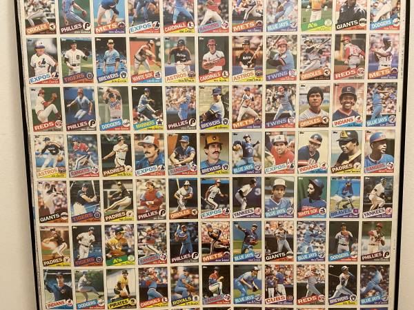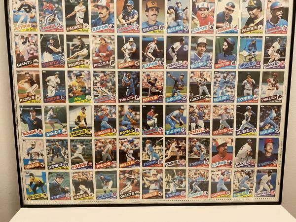 1985 TOPPS BASEBALL UNCUT SHEET, 132 CARDS, FRAMED. HOF & STARS: NOLAN RYAN, TOM SEAVER, RYNE SANDBERG, MIKE SCHMIDT, DON MATTINGLY, EDDIE MURRAY, GARY CARTER, JIM RICE, STEVE CARLTON & MANY...