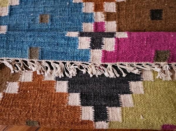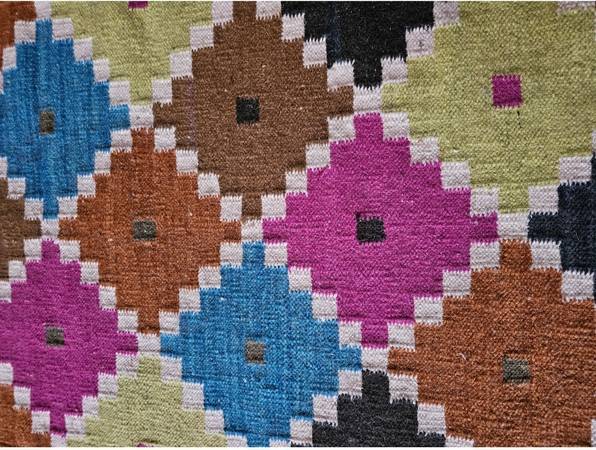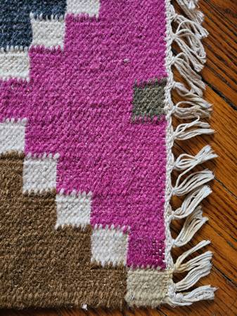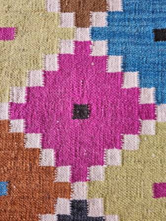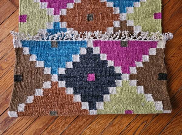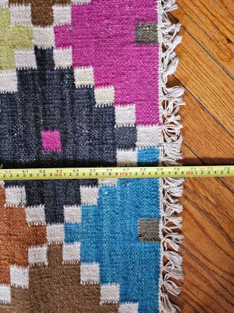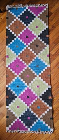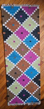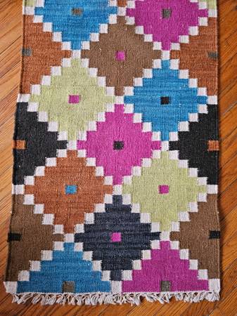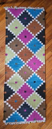 Geometric Turkish Kilim, Rug Runner. 2 ft x 6 ft. Estate find. Kilim is in very good condition with some spots on fringes.