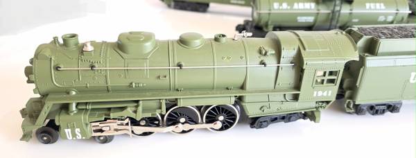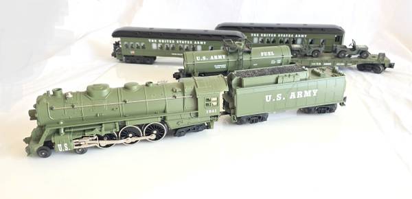 The Lionel Army World War II Set is a vintage model train set manufactured in 2000. This set includes a green locomotive, 5 Cars and a power transformers 80w, all made of plastic and steel. It is designed in O gauge and requires AC power to operate. With a total of 6 items in the set, this Lionel set is a unique addition for collectors and enthusiasts of model railroads and trains.