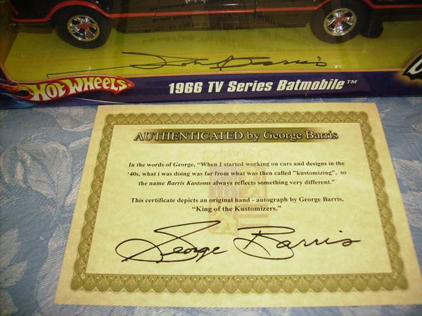 This is a diecast Batmobile signed By George Barris with the certificate of authenticity. There are 2 signatures one on the model and one one the base.I have many other antiques and collectibles !!! NO TEXT OR EMAILS THEY WILL NOT BE ANSWERED CALLS ONLY !!!! CHECK OUT MY OTHER ITEMS !!! OFFERS ARE FREE !!!!!
