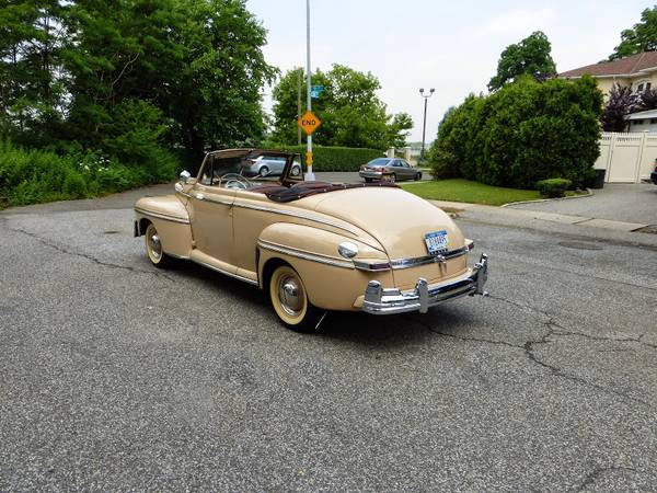1947 Mercury Eight V8 convertible that is very presentable as it is. The car is in beige with a brown interior and it has a black convertible top. It is a V8 with 3 speed on the column and a power top. It is an older restoration and the car is very presentable all around. Paint, chrome and interior are nice. Mechanics are in very good working order. Car runs and drives with a lot of power. Power top motor is little weak. Car comes with a spare wheel and boot cover. A chance to own a true classic car in great condition. Price $25,950.