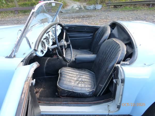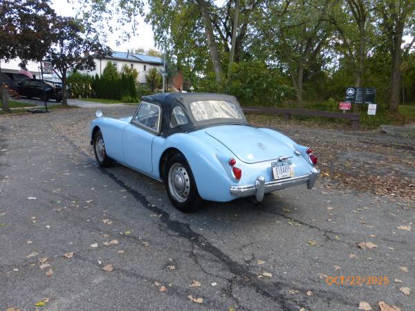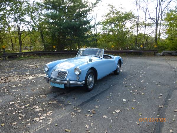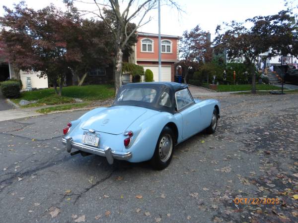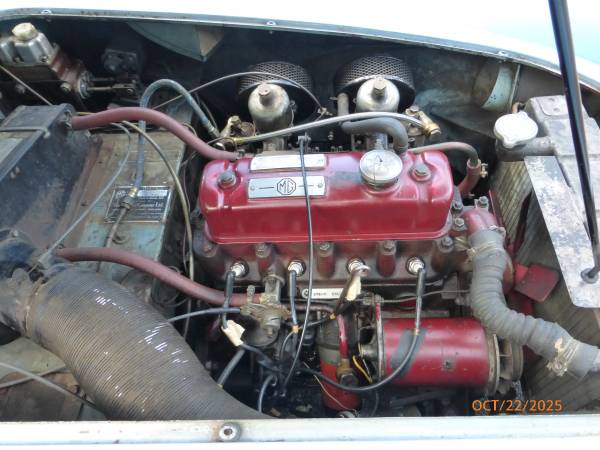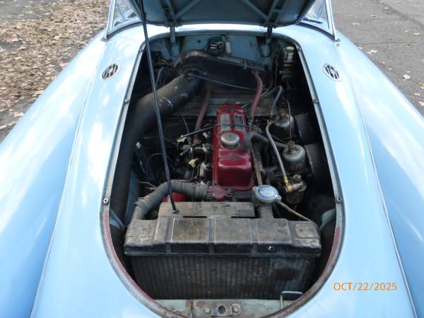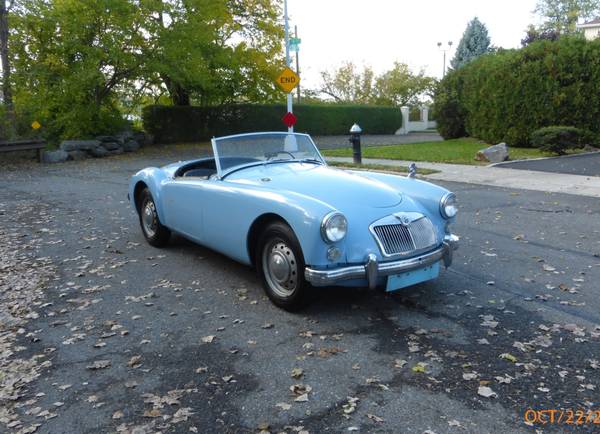 1961 MGA 1600 Roadster that can be driven as it is or taken to a higher level. The car is in baby blue with a blue interior, and it has a black convertible top. It has recently been purchased from the estate of the previous owner. The previous owner had the car since 1962 and the car was driven till 2015, after which it was parked in a garage. The car was repainted in 1975 and the paint is showing age – it is chipping and pealing at a few places. Interior appears to be original and shows wear. Mechanics are in good condition – engine starts easily and runs strong. Transmission shifts smoothly. Odometer shows 63,770 miles which are believed to be original. Mechanically the car shows many new parts including brakes and suspension. Trunk and the underside appear to be solid. Convertible top is in good condition. Side windows are usable. Car comes with a spare wheel, jack, workshop manual and some extra parts. Overall this is nicely preserved classic 1600 MGA that can either be enjoyed as it is or used as a base for a restoration. Price $12,950.