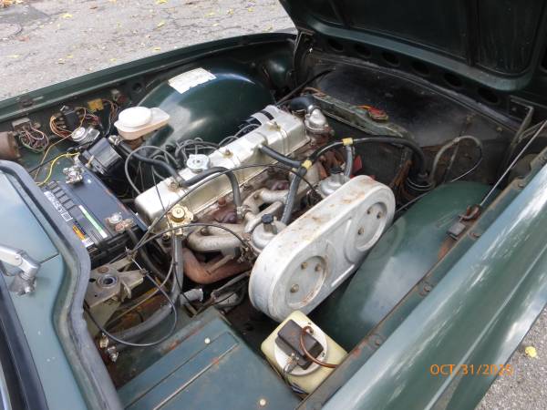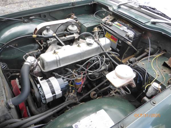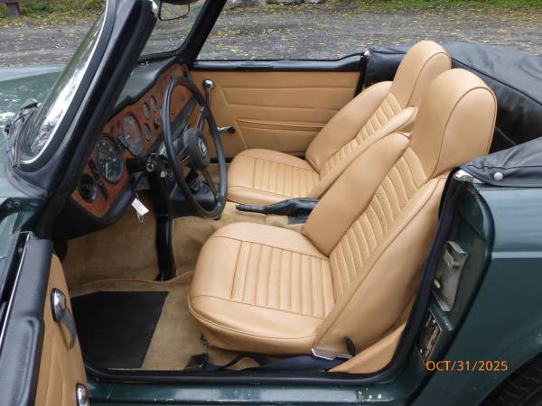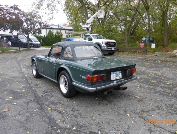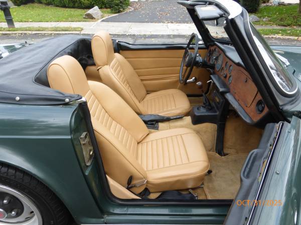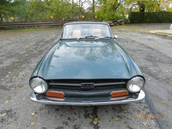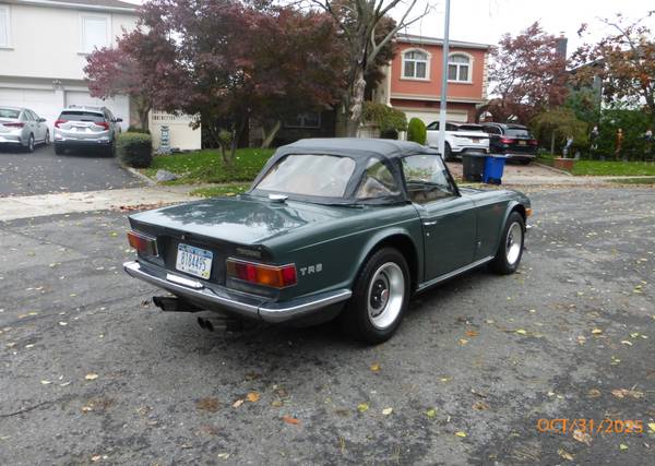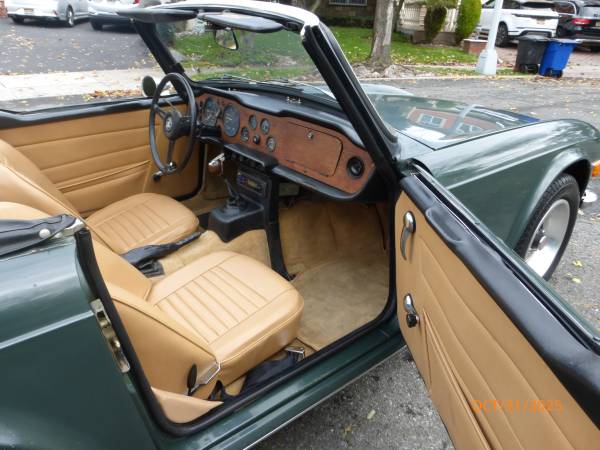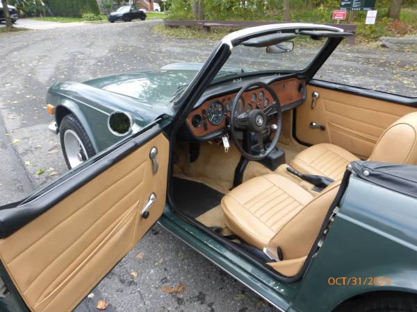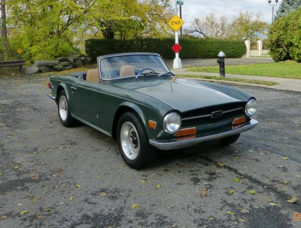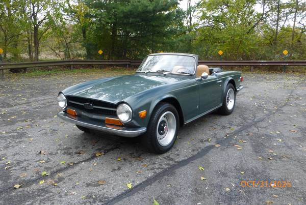 1972 Triumph TR6 that is a very nice car for a collector. The car is in Laurel Green (55) with a New Tan (33) interior. It is a very desirable TR6 in what appears to be original paint, and it has the rare overdrive. Paint is showing age and will benefit from a good buffing. All the chrome and glass is good. Interior is presentable - seats were recovered about 15 years ago. Mechanics are in very good working condition - engine starts easily and runs very smooth. Transmission shifts easily and the overdrive is working. Trunk appears to be solid. Underside is nice - floors and frame appear to be good condition. Convertible top is old, however it can still be used. Car comes with a spare wheel, jack and some extra parts. Overall this is unique TR6 with overdrive (most likely in original paint) that is a good car for a collection. Price $13,950.