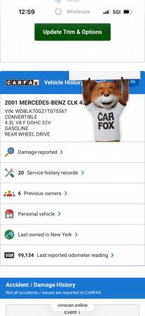 2001 Mercedes CLK 430 V8 Convertible with 99k miles. This beast runs perfect. Strong V8 engine. Oil just change. Top works with no problem. 2 sets of keys. Almost new tires. Never in accident. Just pass NYS inspection. Clean title in hand.