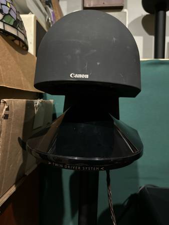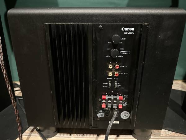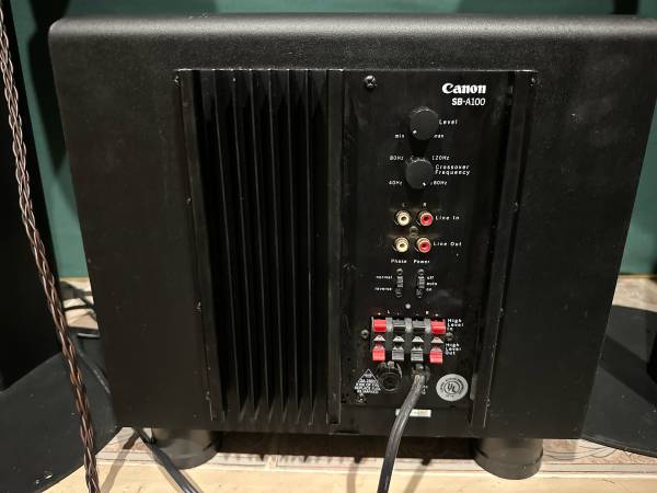 The SB-A100 subwoofer may not look like much but it’s a wolf in sheep’s clothing. This is much heavier than you’d expect- maybe 30-40 pounds. It’s dual ported and uses a hefty 100 watt class AB amplifier to get a visceral impact i’ve only gotten from high end musical subwoofer brands like Rel, Sunfire and Rythmik. When paired with the S-35 speakers it’s truly a unique experience. I have owned other omni-directional speakers by Mirage like the OS3 FS, Nanosats, and OMD-5’s and I have to say the Canon speakers are by far my favorite. I am not in any rush to sell, I have other speakers I’d rather sell before these so the price is firm. I bought them with the intention of having a surround system in the attic but the space is too enclosed to really let the S-35’s breathe. The sides of the speakers need to be a couple feet away from any walls otherwise the soundstage and frequency response starts to get messy.