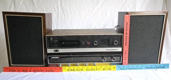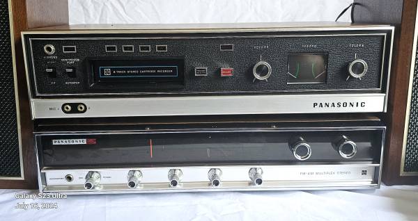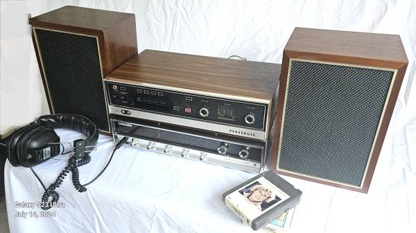 This vintage Panasonic audio system is a must-have for any collector or lover of vintage electronic equipment and it's sound, with this complete audio equipment purchase you can enjoy the music right away as soon you set it up and connected to the power. no worry's about buy something else to make it work and hear you music. The brand is Panasonic and the model is RS803US 8 TRACK & RE7670D RADIO RECEIVER, manufactured in Japan. The system is in working order. come with 2 unbranded speakers than have a good sound, (1) antenna to get a better reception of the radio stations, (1) Stereo headphones JET SOUND Mod. DH-200 made in Korea and (3) 8 track tapes still with good vintage sound. This Panasonic audio system is a rare find in a very good size for small spaces and for anyone who loves vintage audio.