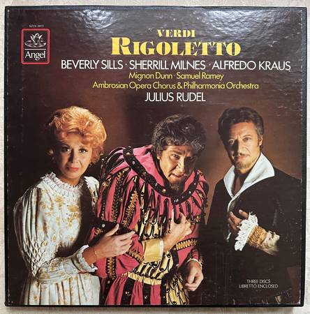 Verdi: Rigoletto - 3 LP Boxed Set - Beverly Sills, Sherrill Milnes, Alfredo Kraus Ambrosia Opera Chorus & Philharmonia Orchestra - Julius Rudel, Conductor Includes 24 page libretto booklet Angel Records SZCX-3872 Near Mint playing surface -- see pictures Box is in Excellent condition