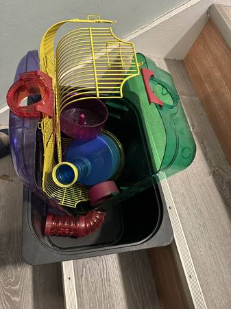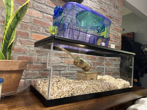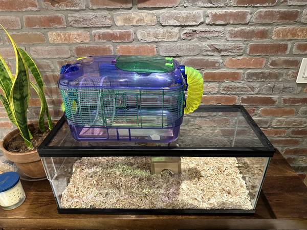 This is a customized, very spacious gerbil/hamster habitat. It includes a 31¼" W × 12½" D × 12¾" H small-animal tank with a smaller cage securely attached on top. I’m also including extra accessories, food, and treats.