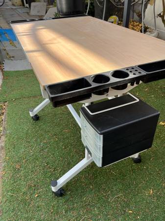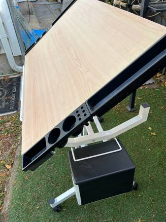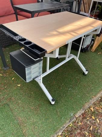 Drafting/craft tilting table, no damage, great shape. Comes on locking wheels with 2 attached storage containers with drawers. 43.5”x24” 30.5” high