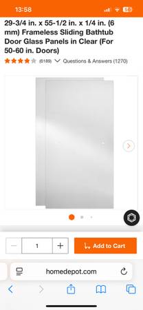 Panels only: contains 2-glass tub panels, each measuring 29-3/4 in. W x 55-1/2 in. H