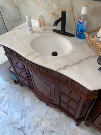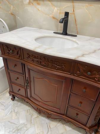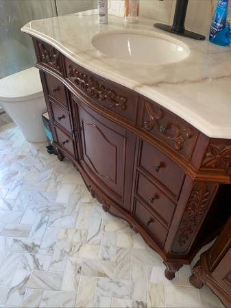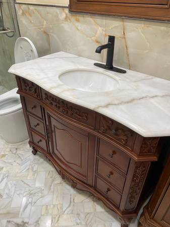 48 in Antique Bathroom Vanity Cabinet with Carrara marble. Used only for less than a year ,like new , pick up in Howard Beach NY zip 11414 New at Home Depot $1600 Text only .