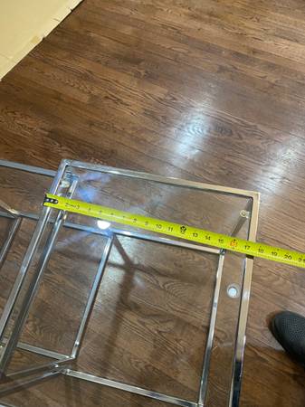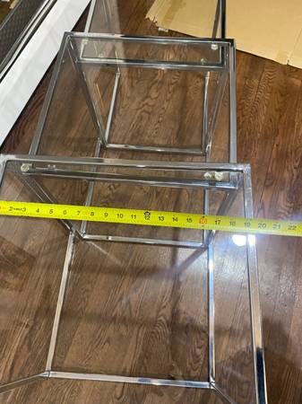 CHROME-GLASS 3 PIECE TABLE SET All 3 pieces in excellent condition See pictures for measurements Able to fit under each other for space saver