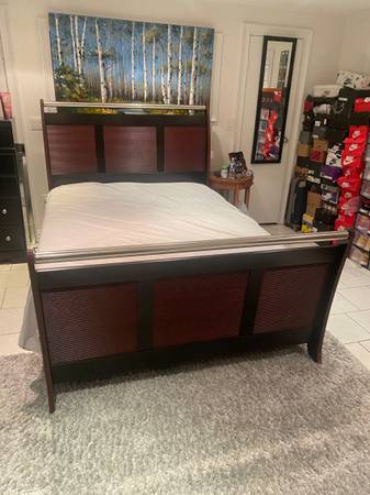 Queen size wood bed frame with memory foam Queen size Mattress Very good condition, mattresses always in protective cover Bed frame 82inches Long x 63inches wide