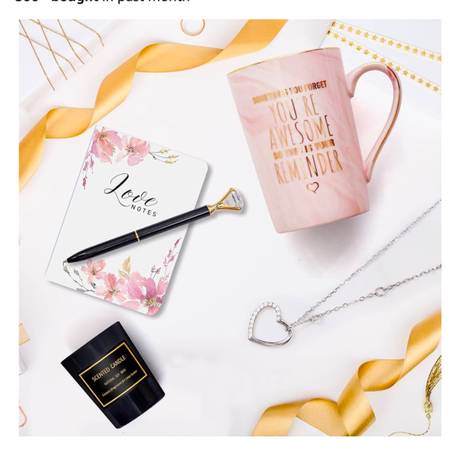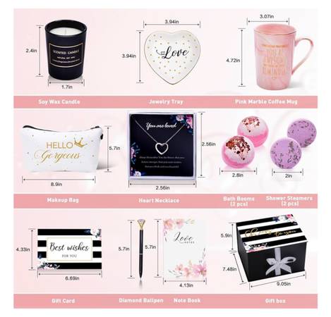 include: 1 pink marble ceramic coffee mug, 1 jewelry tray, 1 silver necklace,1 English pear and freesia scented candle (soy wax candle), 2 rose bath booms, 2 lavender shower steamers, 1 note book, 1 diamond ball pen, 1 ‘hello beautiful’ cosmetic bag, 1 greeting card and 1 gift box.