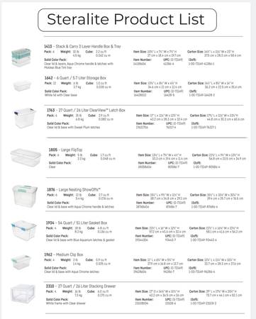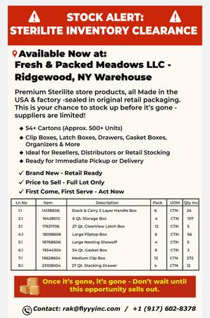 Available Now at: Fresh & Packed Meadows LLC Ridgewood, NY Warehouse Premium Sterilite store products, all Made in the USA & factory -sealed in original retail packaging. This is your chance to stock up before it’s gone suppliers are limited! 54+ Cartons (Approx. 500+ Units) Clip Boxes, Latch Boxes, Drawers, Gasket Boxes, Organizers & More Ideal for Resellers, Distributors or Retail Stocking Ready for Immediate Pickup or Delivery Brand New - Retail Ready Price to Sell - Full Lot Only First Come, First Serve - Act Now.