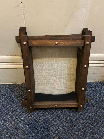 > Interwoven wood frame; aged for a rustic look; pin-able burlap backing for upscale backdrop; clear glass window for crystal clear viewing of your treasured book, magnetic lid for fuss-free design and seamless look, sawtooth hanger on back for effortless wall mounting; minimal wear/marks; also included an 8"x 2" piece of adhesive black felt to rest the book on; may have some dust from storage