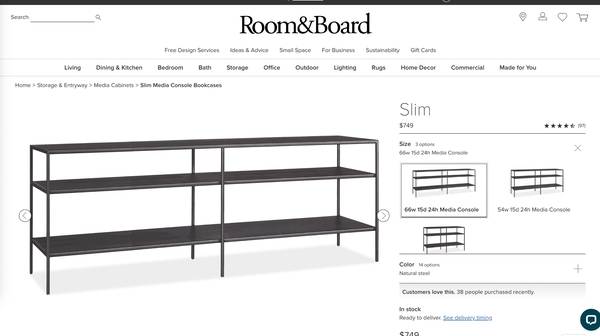 A Room & Board classic, the Slim media console offers a balance of grace and strength. Slim features recycled natural steel with subtle weld marks or durable powder-coated steel in a rainbow of colors.