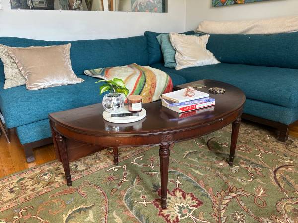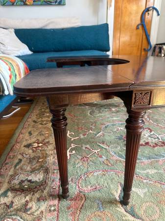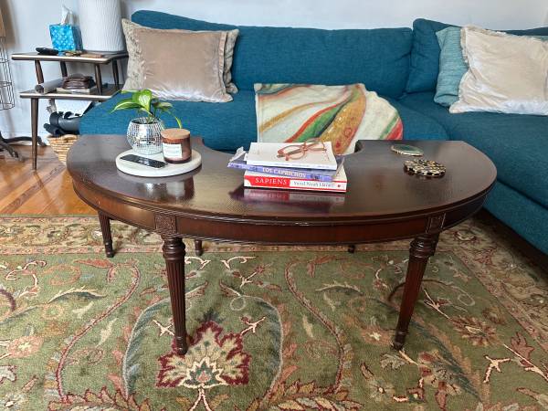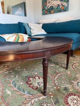 Stunning super rare Georgian style Horseshoe / Half Moon / Demilune drop leaf coffee table. Early 1900s antique -- great condition for age, see some cracking in finish. See similar comps sold for $1500+. Can be used as an accent or display table, this is a great conversation piece! Hate to part with it.