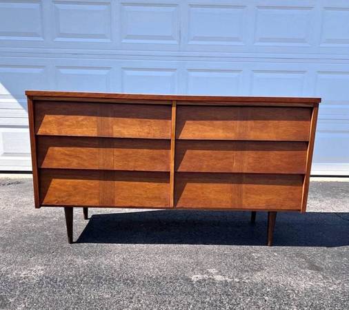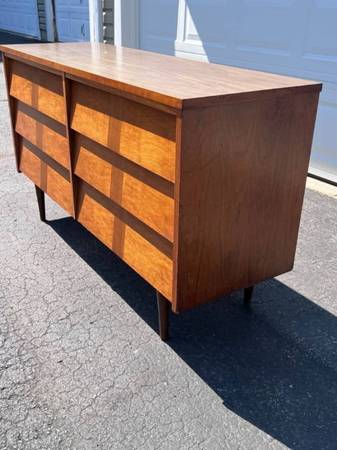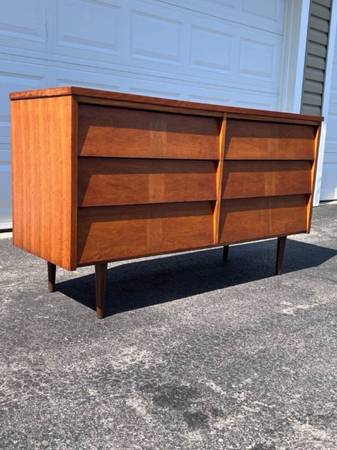 Beautiful mid-century lowboy dresser by Ward Manufacturing. Walnut finishes with a laminate top. It measures 54" long, 18" deep, 30.5" tall. Make a great dresser or a nice size for a credenza....
