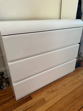 Waterfall dresser in almost perfect condition. One small chip (pictured) but in otherwise excellent condition. Love this piece but no longer fits in my space! Pickup on the third floor off the Fresh...