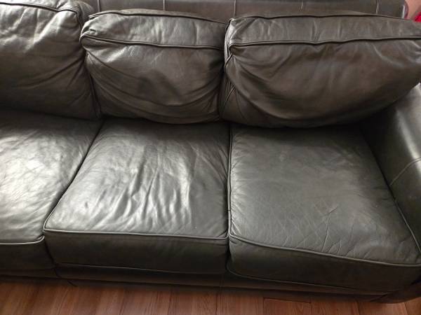 Queen Leather Sleeper Sofa color is black Grey very lovely. Sofa is leather no rips or tears. Smoke free pet free home.