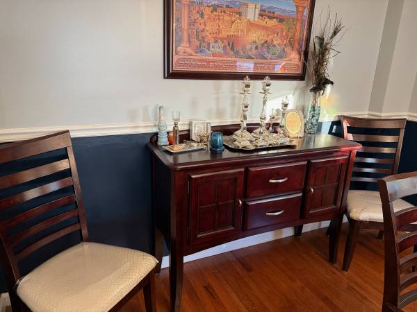 Elegant, oval wooden dining table with eight matching chairs, plus matching buffet. Very good condition. Expandable with one leaf. 44" wide. 90" long with the leaf, 72" without the leaf. Six side chairs, two end chairs with arms. Complete matching set.