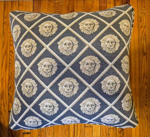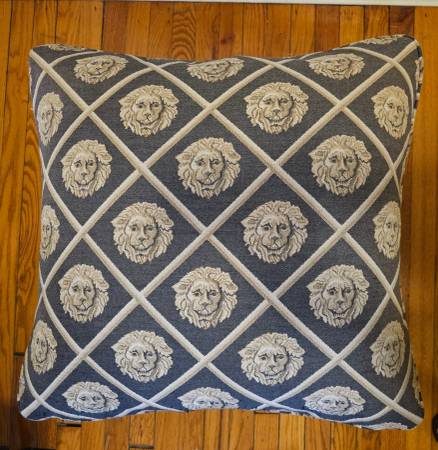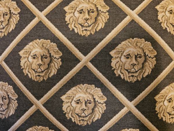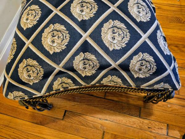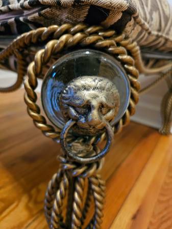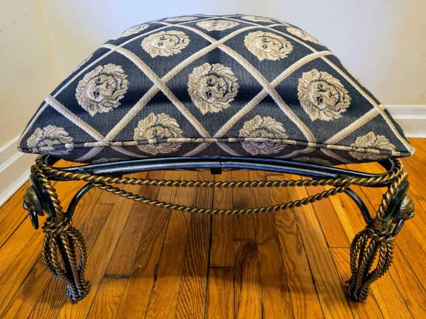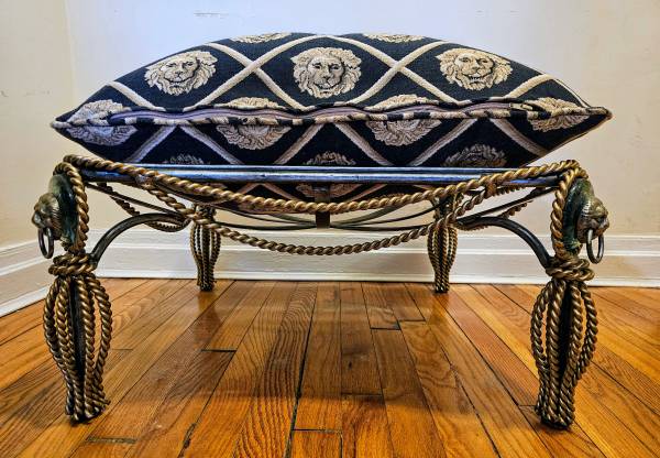 TWO TONED IRON OTTOMAN WITH LION HEAD DECORATION & LION HEAD UPHOLSTERY 24" BY 24" BY 15"